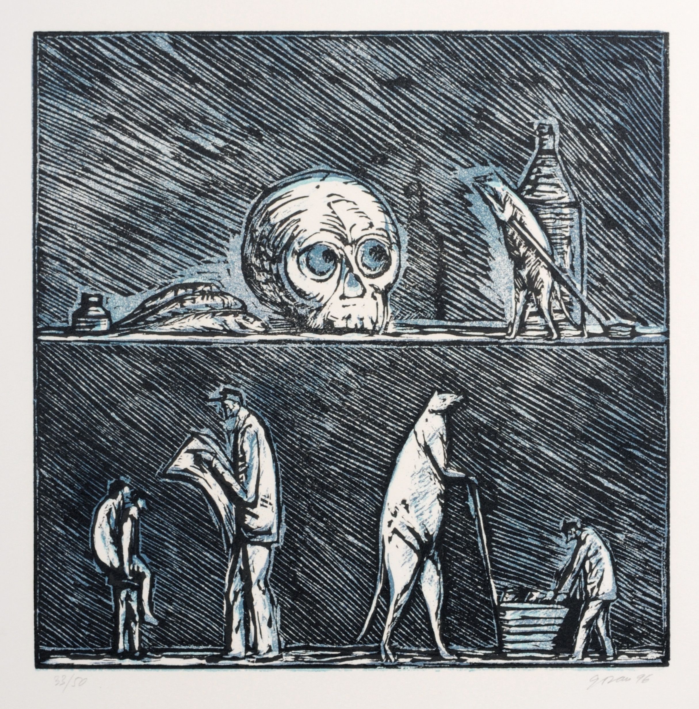 Farbholzschnitte auf "Hahnemühle"-Bütten. Mappe mit sieben Grafiken. Jeweils in Blei signiert "Goran" und datiert u.re. sowie nummeriert "33/50" u.li. Jahresmappe der Edition B 53, 1996. Konzeption: Jürgen Wenzel, Druck: Dieter Meier, Jürgen Wenzel. In der originalen Leinen-Flügelmappe.