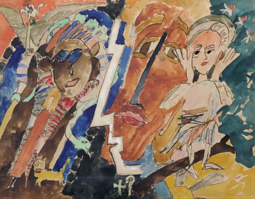 Aquarell und Federzeichnung in Tusche sowie Glitter auf Papier. Unsigniert, in Blei u.li. bezeichnet "G". Auf der Rückwand wohl von fremder Hand bezeichnet und betitelt. Im rotbraunen Passepartout, hinter Glas in schmaler brauner Holzleiste gerahmt.