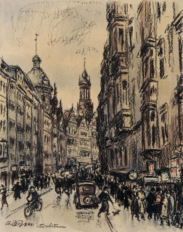 Schwarze Kreide und Aquarell auf kräftigem Velin. U.li. monogrammiert "O.H.M." und bezeichnet "Dresden". An den o. Ecken auf Untersatzpapier montiert, dort unterhalb der Darstellung in Blei re. signiert "O. H. Majores." und li. betitelt. Im einfachem Wechselrahmen gerahmt.