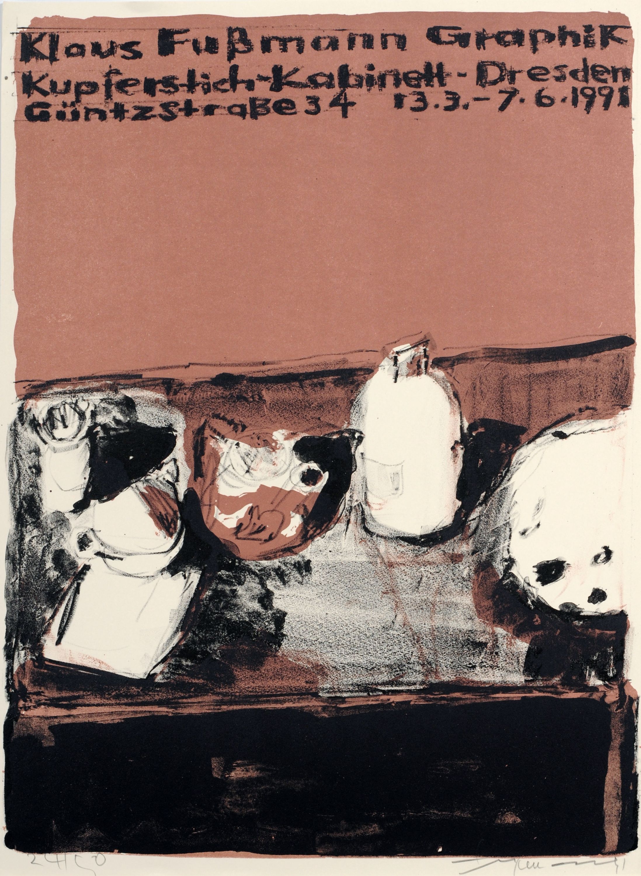 Farblithografie. Plakatauflage. Unterhalb der Darstellung in Blei signiert "Fußmann" und datiert re. sowie nummeriert "24/50" li. Anlässlich der Ausstellung "Klaus Fußmann Graphik" im Kupferstich-Kabinett Dresden vom 13.3.-7.6.1991.