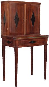 Mahagoni auf Weichholz furniert. Auf vier schlanken, sich nach unten verjüngenden Vierkantbeinen sitzt ein Zargenkasten mit Frontschub. Darauf, zurückgesetzt, ein leicht hochrechteckiger, zweitüriger Aufbau mit ausklappbarer Schreibplatte und inneliegenden Fächern. Alle Flächen werden durch filigrane Ketten-Bandeinlagen gefeldert, in denen leicht erhabene, ebonisierte Rauten sitzen. Oberer Abschluß mit eingelegter weiss-grauer Marmorplatte. Filzbelag der Schreibplatte ergänzt.