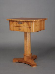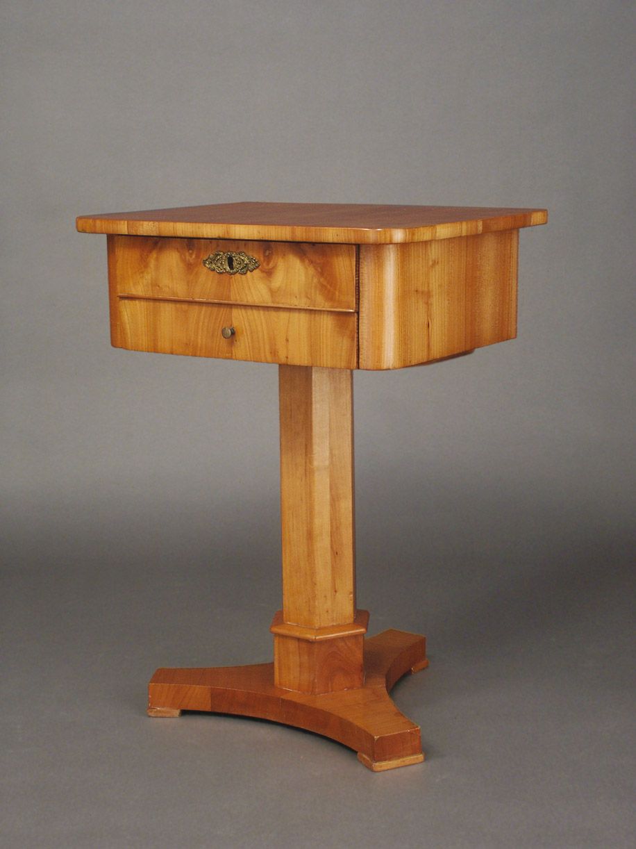 Kirschbaum auf Weichholz furniert. Doppelschübiger Zargenkasten mit Sechskant-Säule auf dreipassig eingebogter Fußplatte. Schloß und Beschlag alt ergänzt.