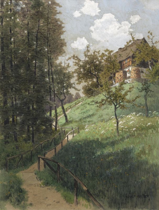 Aquarell über Kohlestiftzeichnung auf grauem Papier. In Blei u.re. betitelt und datiert sowie in Schwarz signiert "ADOLF NOETHER". Hinter Glas in schmaler Holzleiste gerahmt.