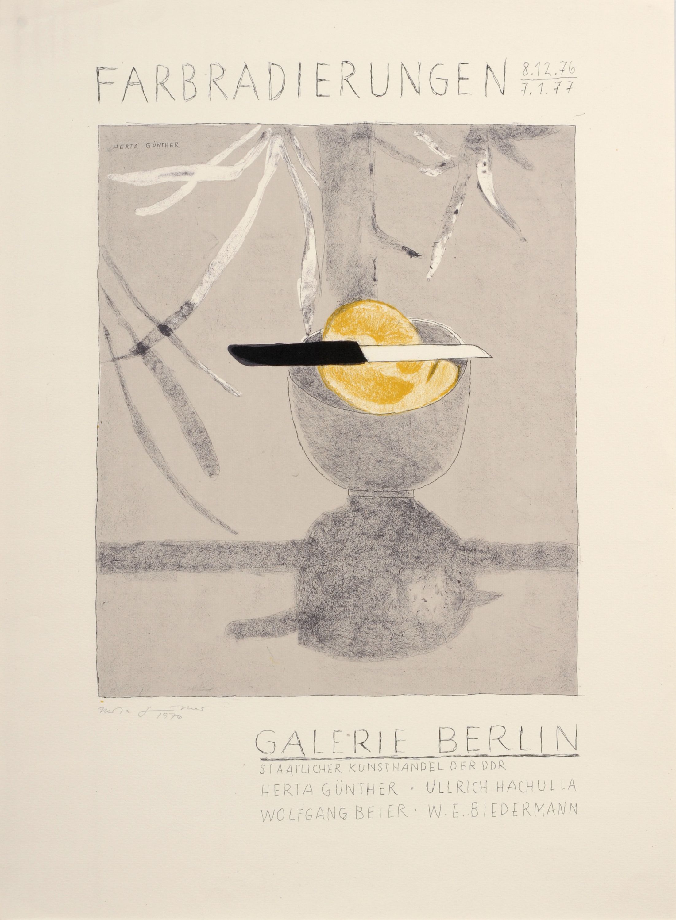 Farbzinkografie auf Maschinenbütten. Plakatauflage. Im Stein signiert "HERTA GÜNTHER" o.li. In Blei unterhalb der Darstellung nochmals signiert "Hertha Günther" und datiert u.li. Plakat für die Ausstellung "Farbradierungen" der Galerie Berlin, 08.12.1976–07.01.1977. Eines von 100 Exemplaren.