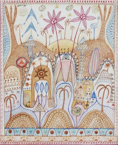 Aquarell, Faserstift und Federzeichnung in farbiger Tusche auf chamoisfarbenem Bütten. O.li. signiert "HAAS" und datiert. Hinter Glas in einer hochwertigen, mehrfarbigen und zum Teil vergoldeten Modellleiste gerahmt.