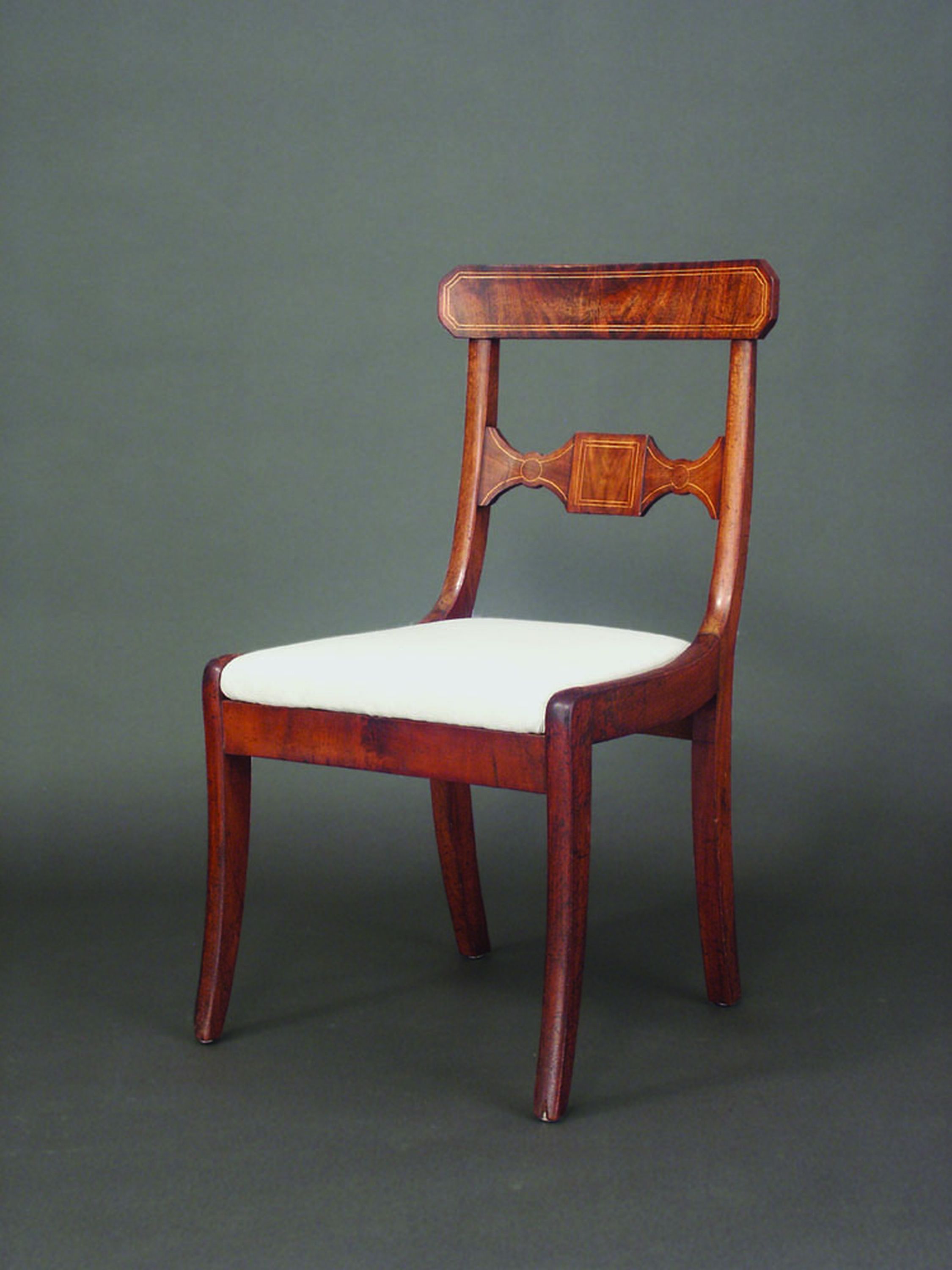 Mahagoni. Seitenrahmenkonstruktion. Breites, geformtes Lehnenbrett, gekanntete Ecken, doppelte Fadenintarsien in Ahorn. GesÃĪgte Mittelsprosse, ebenfalls mit Fadenintarsien in Ahorn.