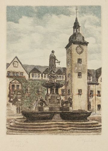 Radierung/Farbradierung. Jeweils bezeichnet und signiert. "Rathaus" im Passepartout.