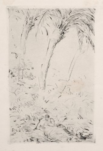 Kaltnadelradierung mit Tonplatte auf "Van Gelder Zonen"-Bütten. In der Platte u.li. signiert "Meid" und datiert. Auf bedrucktem Japan, welches lose auf das Blatt montiert wurde, typographisch u.Mi bezeichnet "Hans Meid, Idylle", re. technikbezeichnet sowie li. mit dem Vermerk "Kunst und Künstler" versehen. Aus "Kunst und Künstler", Verlag Bruno Cassirer, Berlin 1913, Jg. XI, Heft XII.