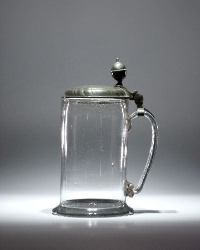 Farbloses Glas. Zylindrischer Korpus auf ausgestelltem Stand, breiter Bandhenkel. Montierter, leicht gewölbter Scharnier-Zinndeckel mit kugelförmiger Daumenrast. Im Deckel dreifach gemarkt.