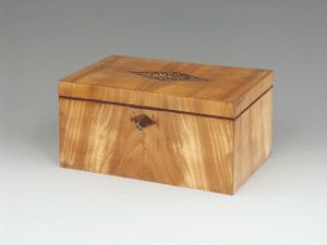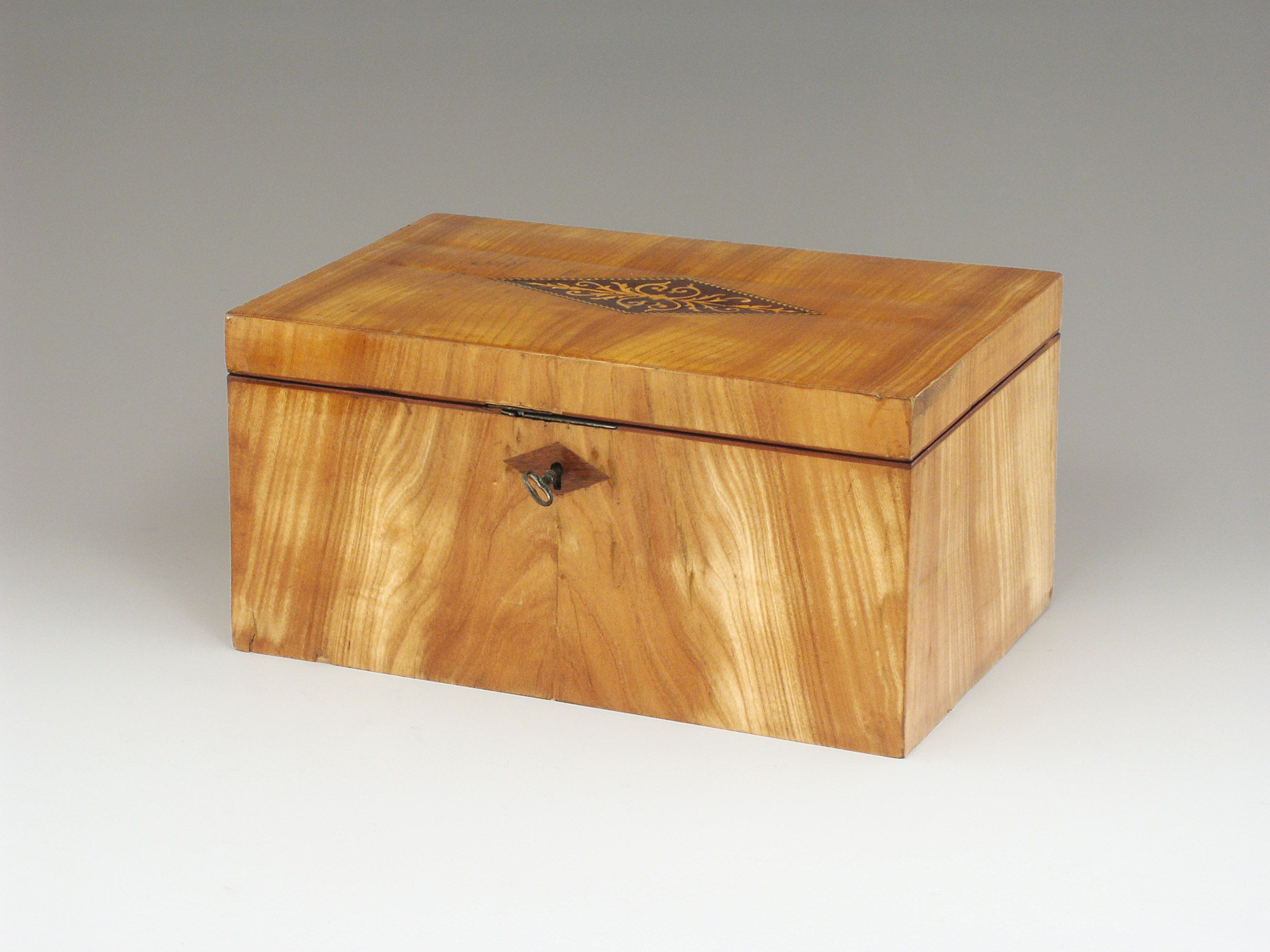 Kirschbaum auf Weichholz furniert, im Deckel intarsierte Raute mit Arabeske in Ahorn und Mahagoni . Schloss defekt.