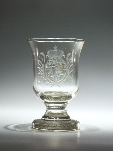 Farbloses, dickwandiges Glas. Kuppa mit leicht ausgestelltem Mündungsrand. Kursächsisches Wappen unter Kurhut in Mattschnitt. Höherer Scheibenfuß.