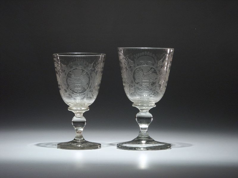 Farbloses Glas. Balusterförmiger Schaft mit Scheibennodus über einem Scheibenfuß. Konische Kuppa mit dem Familienwappen derer "von Zehmen" in Mattschnitt sowie reichem Dekor.