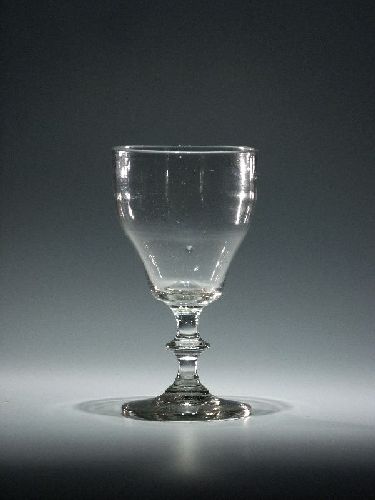 Farbloses Glas. Glockenförmige Kuppa. Schaft mit gedrücktem Scheibennodus auf Rundfuß mit Abriß.