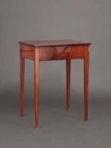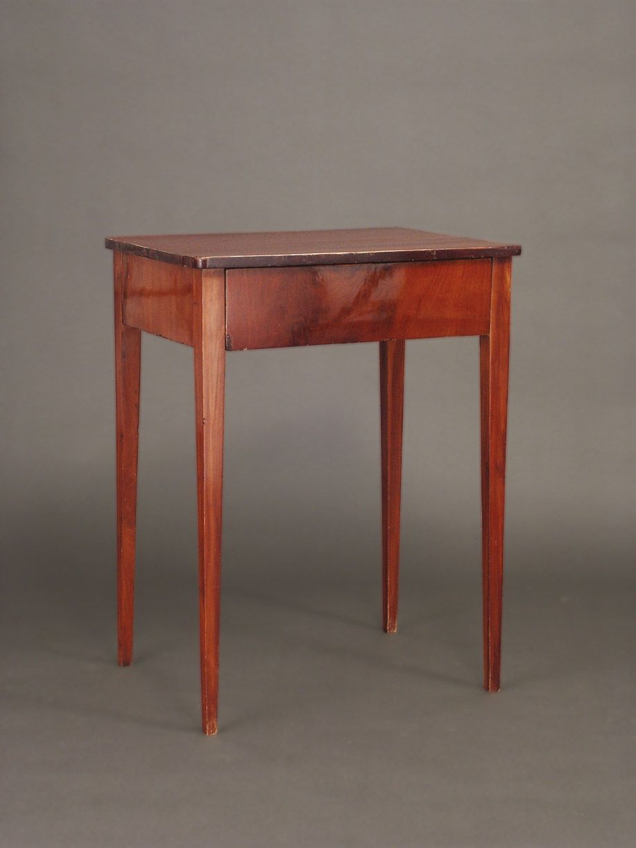 Mahagoni und Mahagoni auf Weichholz furniert. Schlichter Zargenkasten mit verstecktem Schub, leicht überstehender Platte und abgerundeten Ecken auf vier schlanken, sich nach unten verfüngenden Vierkantbeinen. Altersbedingte Gebrauchsspuren.