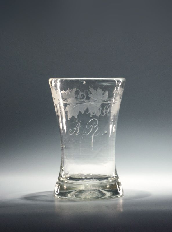 Farbloses Glas. Leichte Spindelform. Fuß mit Abriß. Geschliffene Blattbordüre auf der Wandung.