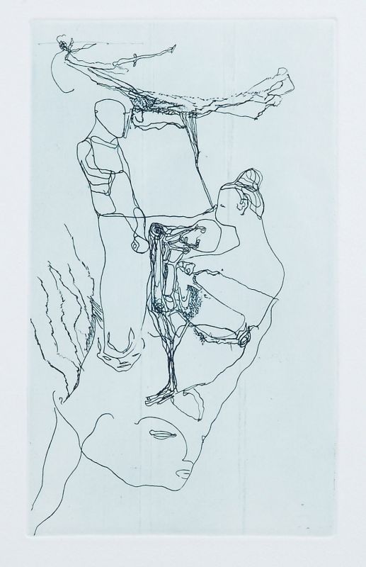 Radierung auf "HAHNEMÜHLE"-Bütten mit blauem Plattenton. Außerhalb der Platte signiert "Morgner", "Volmer" "Ranft", eine Signatur unleserlich u.Mi. und nummeriert "1/20" u.li.