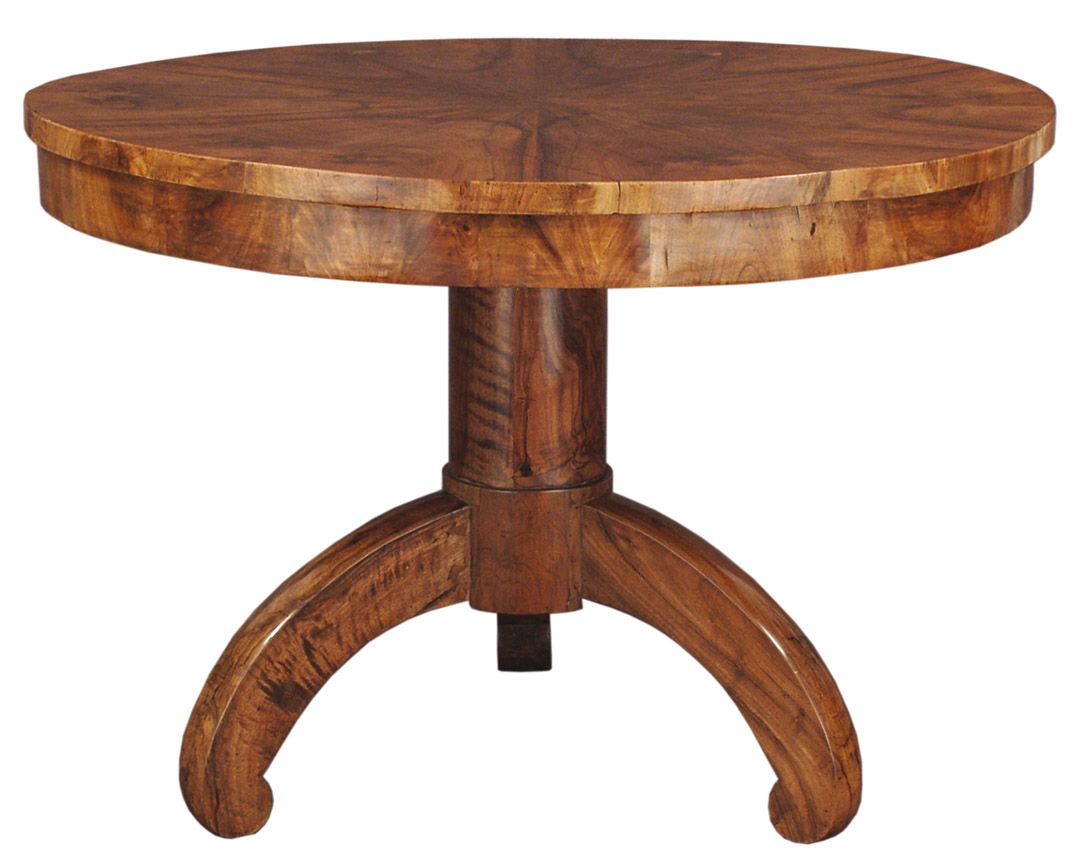 Nußbaum und Nussbaum auf Weichholz furniert. Runde Platte sternfurniert mit Zarge. Runde Mittelsäule auf drei ausgestellten Volutenfüßen.