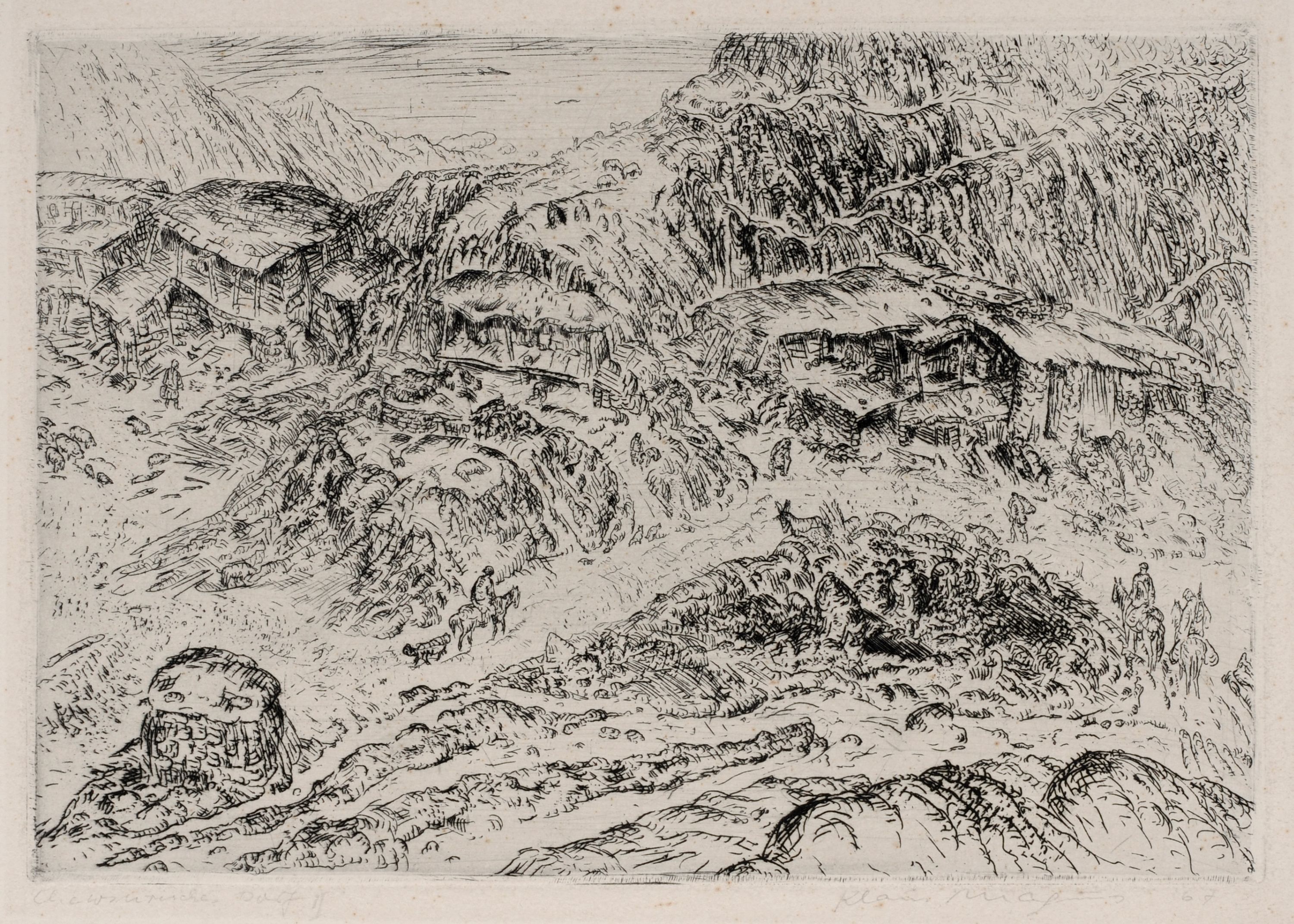 Radierungen auf Bütten. Landschaftsdarstellung in Blei bezeichnet "Chewsurisches Dorf II" (?) u.li., signiert "Klaus Magnus" und datiert u.re. Personendarstellung in Blei nummeriert "27/65" u.li., signiert "Gerhard Kettner" und datiert u.re. Jeweils an den o. Ecken im Passepartout montiert.