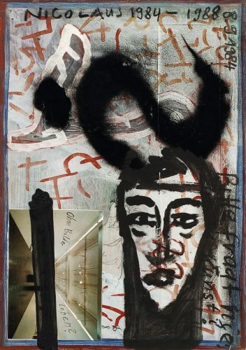 Collage, auf Harfaser montiert. Signiert "Nikolaus" und datiert o.Mi. Hinter Glas gerahmt.