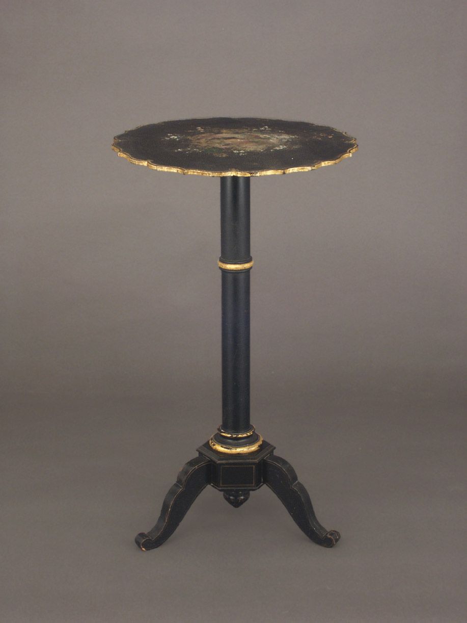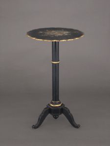 Holz, schwarz lackiert, mit Krakelee - Lack auf der Platte. Diese mit gebogtem, goldenem Rand und Blumenmalerei (starke Abnutzungsspuren). Runde Säule auf geschweiftem Dreifuß, Randvergoldungen. Ein Füßchen leicht beschädigt.