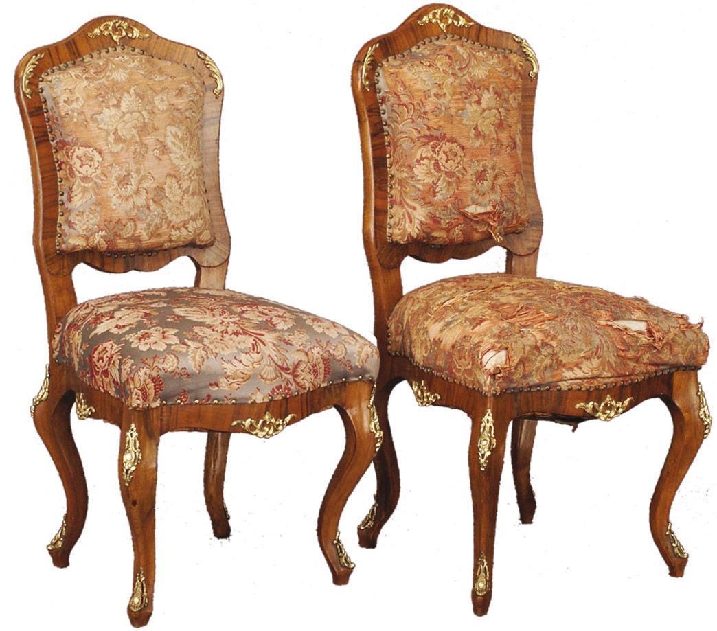 Gestell in Nußbaum und Nußbaum furniert. Beine geschweift, in die geschweiften Zargen einlaufend. Sitz und Rückenlehnen gepolstert, Lehnen in geschweifter Rahmenform mit halbmondförmiger Bekrönung. Zierbeschläge aus vergoldeter Bronze an den Ecken und der Bekrönung der Lehne sowie an den Beinen und der Zarge. Stoffbezug teilweise stark beschädigt.