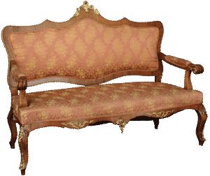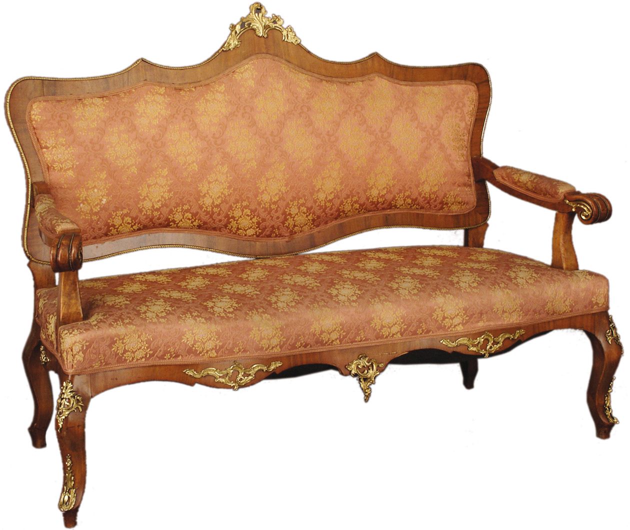 Nussbaum und Nussbaum furnier. Silhouettiert geschweifte Rückenlehne und Zargenfront. Geschweifte, schräg gestellte Füße, Armlehnen mit Voluten-Enden. Reiche Bronzeverzierungen. Neuerer Stoffbezug.