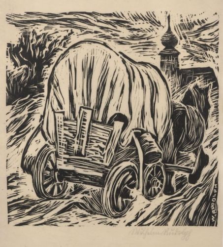 656 Wilhelm Rudolph "Planwagen und Kirche". Vor 1924.