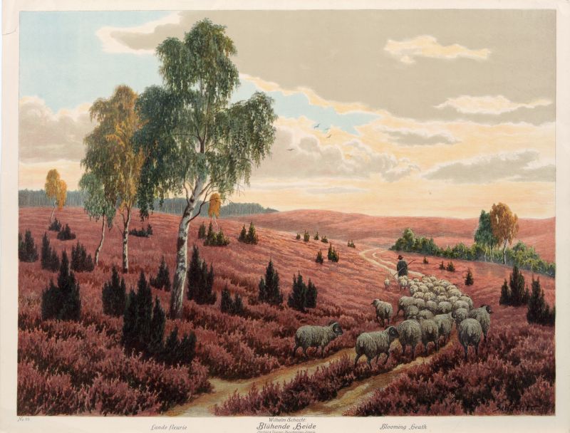 Farblithographien auf kräftigem Papier. "Blühende Heide" (No. 44) im Stein u.re. signiert "Schacht". "Sonnenaufgang in der Heide" (No. 55) im Stein u.li. signiert "W. Schacht", sowie mit dem Monogramm des Verlags "M&D" u.re. Beide Blätter unterhalb der Darstellung typographisch bezeichnet mit Künstlernamen, Titel (dt., frz., engl.) und "Merfeld & Donner, Kunstverlag, Leipzig", ein Blatt technikbezeichnet u.re.
