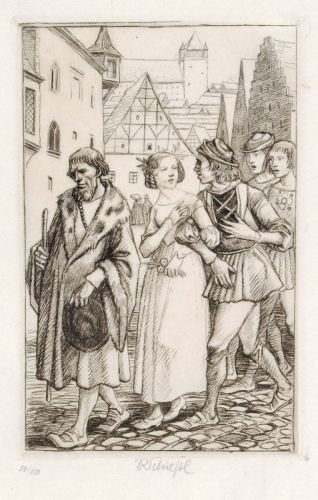 Kaltnadelradierung mit Tonplatte auf Japan. In Blei signiert mittig unterhalb der Darstellung "R Schiestl" und nummeriert "58/150" u.li.
