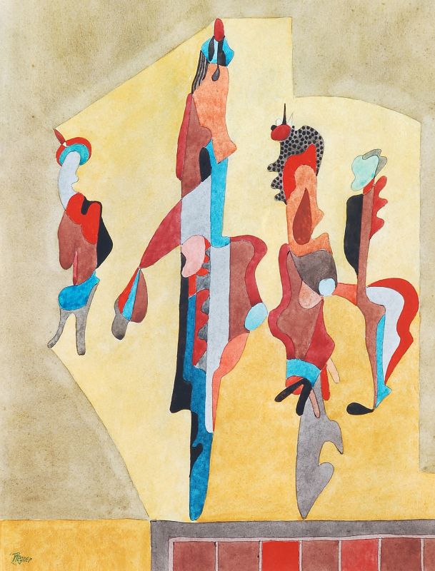 686 Erich Wegner, Abstrakte Formen auf ockerfarbenem Grund. Wohl um 1970.