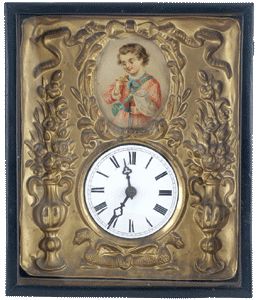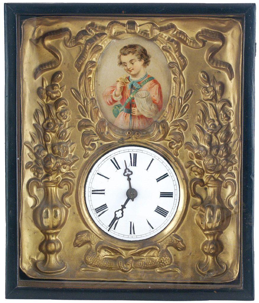 Ebonisierter Holzrahmen mit Verglasung. Geprägtes Messingblech, Emailziffernblatt, darüber Kartusche mit der Darstellung eines jungen Schmetterling-Fängers. Ungemarktes Holz-Werk m. Haken-Pendelaufhängung u. Halbstundenschlag auf Tonfeder. 1 Eisen-Gewicht. Geringe Altersspuren. Verglasung ergänzt, eine Kette defekt.