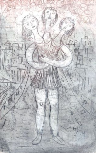 "Dreikopf". Mischtechnik, Ritzung über farbigem Grund auf Karton. U.re. mittels Ritzung monogrammiert "Tei" und datiert. U.li. in Tusche betitelt. Verso mit Schriftzug "Volksfest" als typografischer Entwurf.