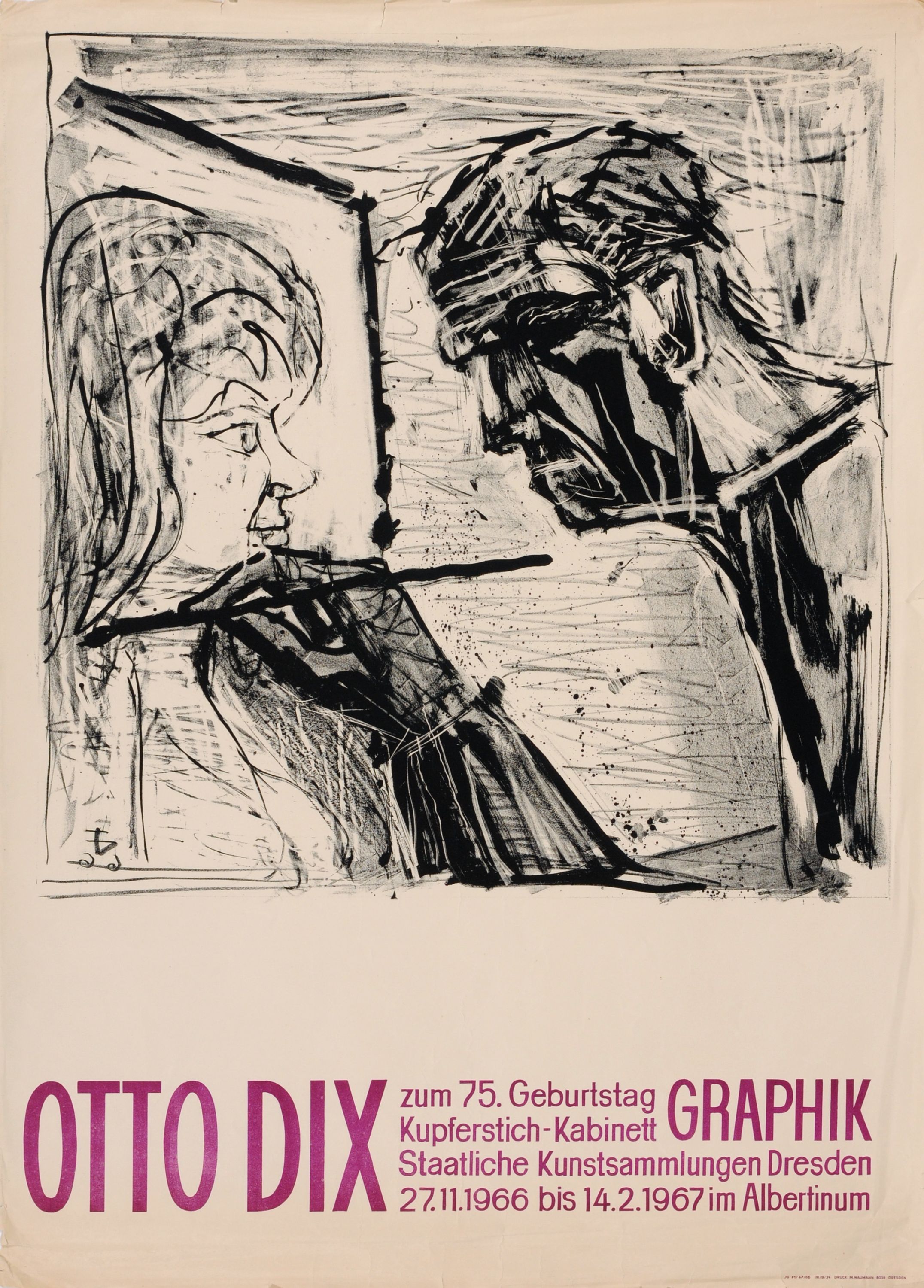 a) Otto Dix "Selbstbildnis im Profil beim Malen". Lithografie. Plakatauflage (Maschinendruck vom Stein). 1966.