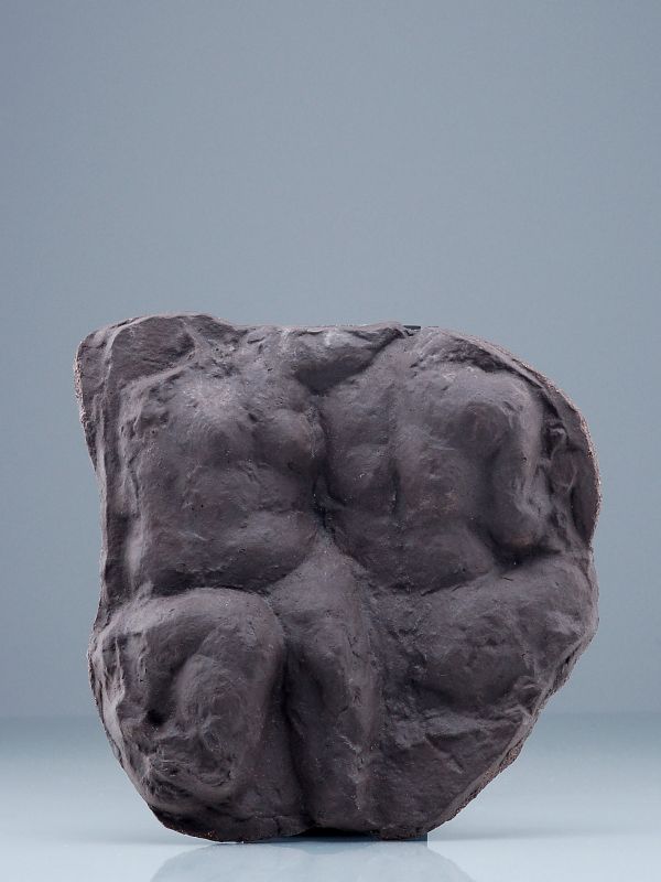Keramik, terrakottafarbener Scherben, in dunklen Erdfarben matt glasiert. Unsigniert. Flachrelief mit zwei nebeneinander sitzenden weiblichen Torsi.