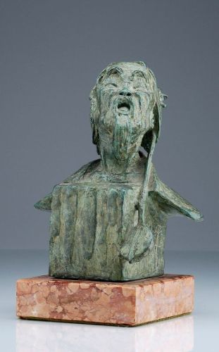 Bronze, grün patiniert. Vollplastische, aus einem kubischen Sockel erwachsende Büste eines alten Mannes. Den Mund weit zum Gesang geöffnet über die linke Schulter die "Tov Schuur" gelegt, das typische Instrument der westlichen Mongolei. Am Sockel seitlich unleserlich signiert. Auf quaderförmigen Natursteinsockel montiert.