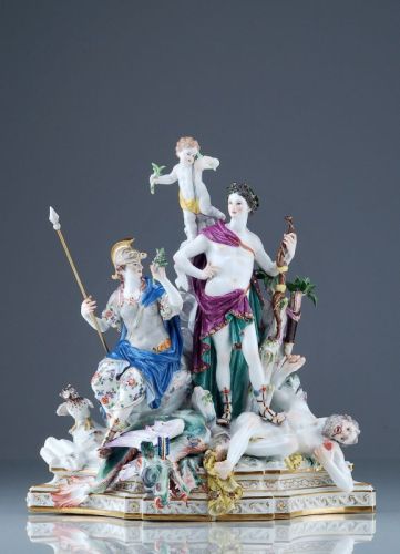 Den Entwurf des für seine Zeit typischen Figurenprogramms fertigte Kaendler für die sogenannte "Große russische Bestellung" von 1772 aus. Die Figur der Athene kann als Huldigung des Künstlers an Zarin Katharina II. aufgefasst werden.