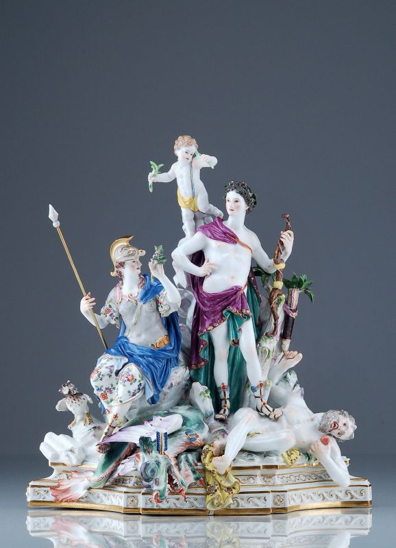 Porzellan, glasiert, in polychromer Aufglasurmalerei staffiert. Auf einem getreppten Sockel erheben sich die Figuren der Athene und des Apollon. Beide mit ihren Attributen versehen und mit Assistenzfiguren unter den Füßen in Form eines Drachen und des sich windenden Marsyas. Hinter Apoll steht ein Putto auf einem Felssockel.