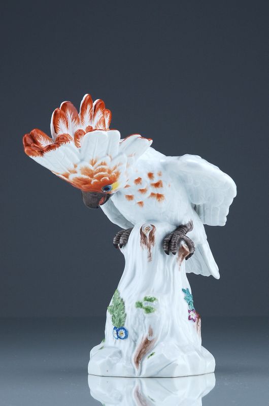 Porzellan, glasiert. Auf einem blumenverzierten Baumsockel sitzt ein den Blick nach unten richtender Kakadu. Die aufgelegte Blumen am Sockel und der Vogel naturalistisch in polychromer Aufglasurmalerei dekoriert. Auf der Sockelrückseite unten zweifach gestrichene Schwertermarke in Unterglasurblau. Innenseitig mit geritzter Formnr. "57a" und Pressnr.
