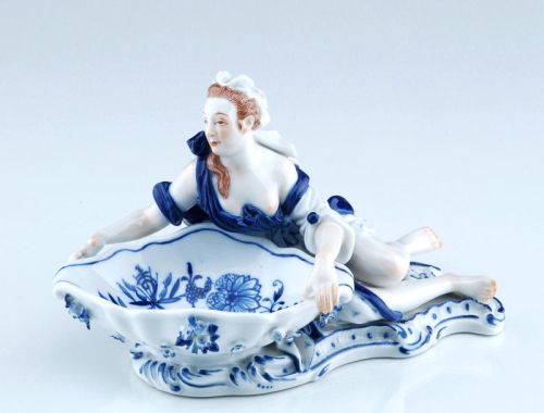 Porzellan, glasiert. Kopf und Inkarnat naturalistisch in polychromer Aufglasurmalerei staffiert. Kleid, Schale und Sockel in Unterglasurblau im Zwiebelmuster dekoriert. Auf einem Rocaillesockel. Boden mit Schwertermarke in Unterglasurblau, Formnr. "73029", Prägenr. und Jahreszeichen.
