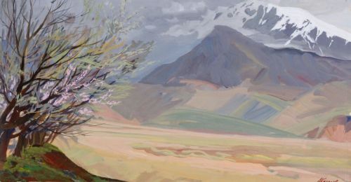 Tempera auf Malpappe. Signiert u.re. Verso in schwarzem Faserstift kyrillisch bezeichnet, datiert und betitelt o.li. Ein klebemontiertes Zollausfuhr-Papieretikett aus Usbekistan aus dem Jahr 1969 o.re., darauf typographisch sowie in Kugelschreiber kyrillisch beschriftet. Verso auf dem Rückseitenschutz in Kugelschreiber ausführlich bezeichnet u.re. Im Passepartout montiert und in profilierter, weißer Leiste gerahmt.