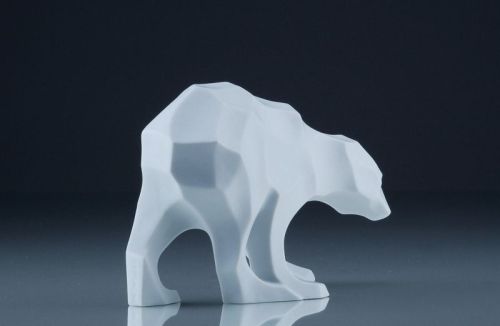 Porzellan, unglasiert. Kubistische, vollplastische Figur eines schreitenden Eisbären. Boden mit Künstlersignatur und Manufakturmarke in grüner Aufglasurmalerei. Mit einer Bestätigung des Künstlers.