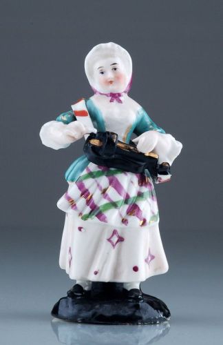 Porzellan, glasiert. Vollplastische Figurine auf naturalistischem Sockel. In polychromer Aufglasurmalerei staffiert und sparsam vergoldet. Ungemarkt.