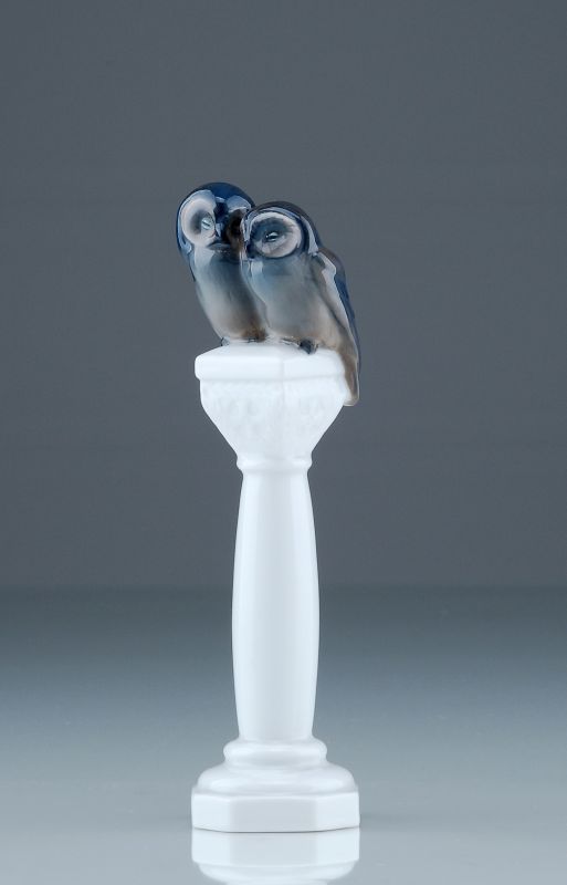 Porzellan, glasiert. Auf einer romanischen Säule mit Würfelkapitel sitzen zwei aneinander geschmiegte Eulen. Naturalistisch in Unterglasurfarben staffiert. Am Boden grüne Rosenthal Selb-Bavaria Marke, Formnr. "H 107" und Preßnr.