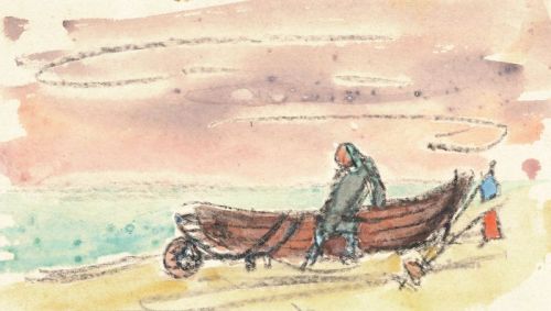 734 Gerhard Vontra, Abendliche Strandszene mit Boot. 1946.