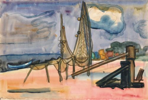 736 Horst Weber "Kölpinsee auf Usedom" (Trocknende Fischernetze). 1964.