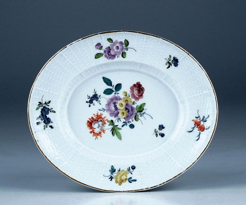 Porzellan, glasiert. Ovale, tief gemuldete Form. Fahne mit "Altozier" Reliefzierat. Spiegel und Fahne mit manieristischem Blumendekor in polychromer Aufglasurmalerei. Rand goldstaffiert. Boden mit schwach lesbarer Schwertermarke in Unterglasurblau.