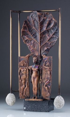 Bronze, gegossen und verlötet, rötlich-schwarz patiniert; weißer Granit. Signiert an Vorderkante u.li. "DETKOS A" und datiert. Mehrfigurige Komposition auf schwarzem Granitsockel.