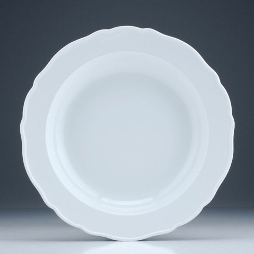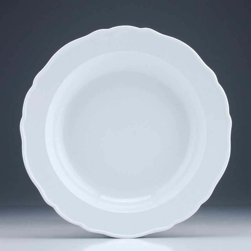 Porzellan, glasiert. Tiefe Form. Aus dem Service "Neuer Ausschnitt". Boden mit Schwertermarke in Unterglasurblau, einfacher Schleifstrich seitlich der Marke für Weißware guter Qualität. Ritz- und Prägenrn.