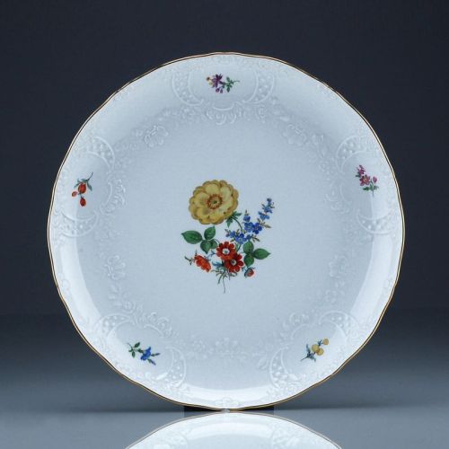 Porzellan, glasiert. Runde, leicht gemuldete Form. Der Spiegel mit Reliefzierat "Neumarseille" und Blumenbouquet in polychromer Aufglasurmalerei dekoriert. Auf der Fahne gestreute Blümchen in polychromer Aufglasurmalerei. Rand goldstaffiert. Am Boden zweifach gestrichene Schwertermarke und Malerzeichen in Unterglasurblau, Prägenrn. und Jahreszeichen.