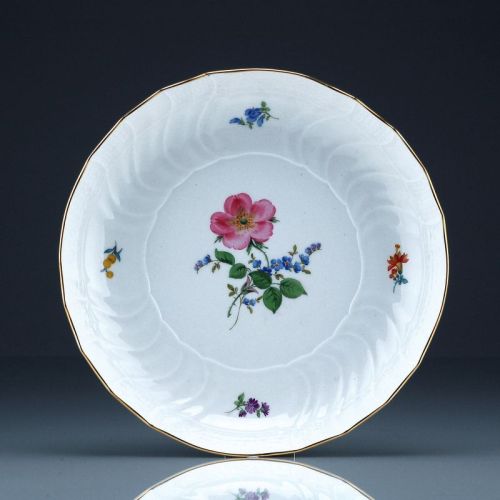 Porzellan, glasiert. Tief gemuldete Form mit steiler Fahne. Aus dem Service "Neubrandenstein". Der Spiegel mit Rose und Vergissmeinicht sowie Streublümchen in polychromer Aufglasurmalerei dekoriert. Rand goldstaffiert. Am Boden zweifach gestrichene Schwertermarke und Malerzeichen in Unterglasurblau, Preßmarke und Malerzeichen in Eisenrot.